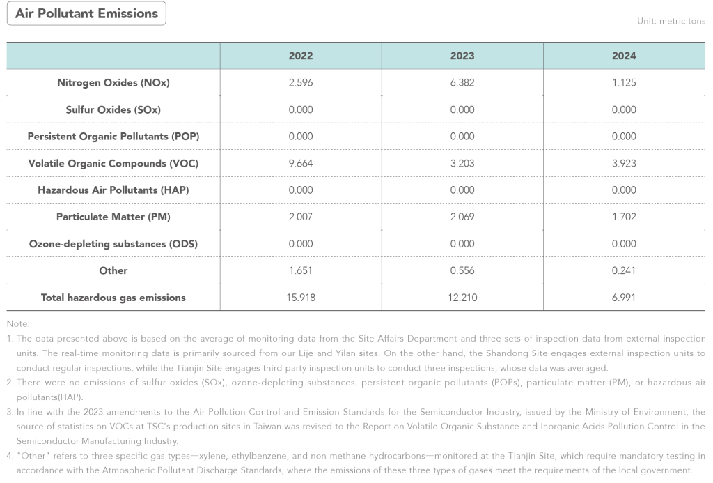 TSC is committed to air pollution prevention and environmental protection. All of our production sites comply with local environmental laws and regulations and undergo regular gas testing. The primary types of gases generated in the production process at our production sites include acid waste gas and volatile organic compounds (VOCs). In addition, a small amount of flue gas is emitted from the solid crystal welding process, which is treated by the acid-alkali scrubbers, ionization decomposition, fume filtration, and VOCs adsorption treatment systems, while a third-party inspection organization is commissioned to conduct regular inspections to ensure that the emission standards are met. Due to differences in the nature of wafer fabrication and assembly/testing processes at each plant, the types of air pollutants generated vary slightly.