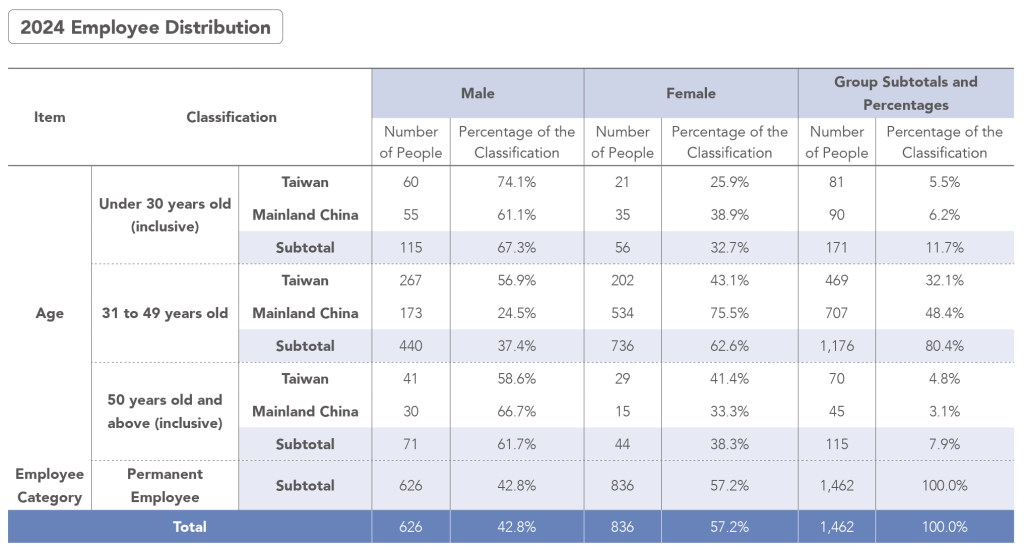 In 2024, various regions will respond to the company’s long-term development plans and organizational adjustments by establishing a variety of specialized departments and conducting more detailed division of duties within existing departments. This aims to enhance operational efficiency and strengthen long-term competitiveness. The total number of full-time employees at all locations in Taiwan and China combined is 1,462.
