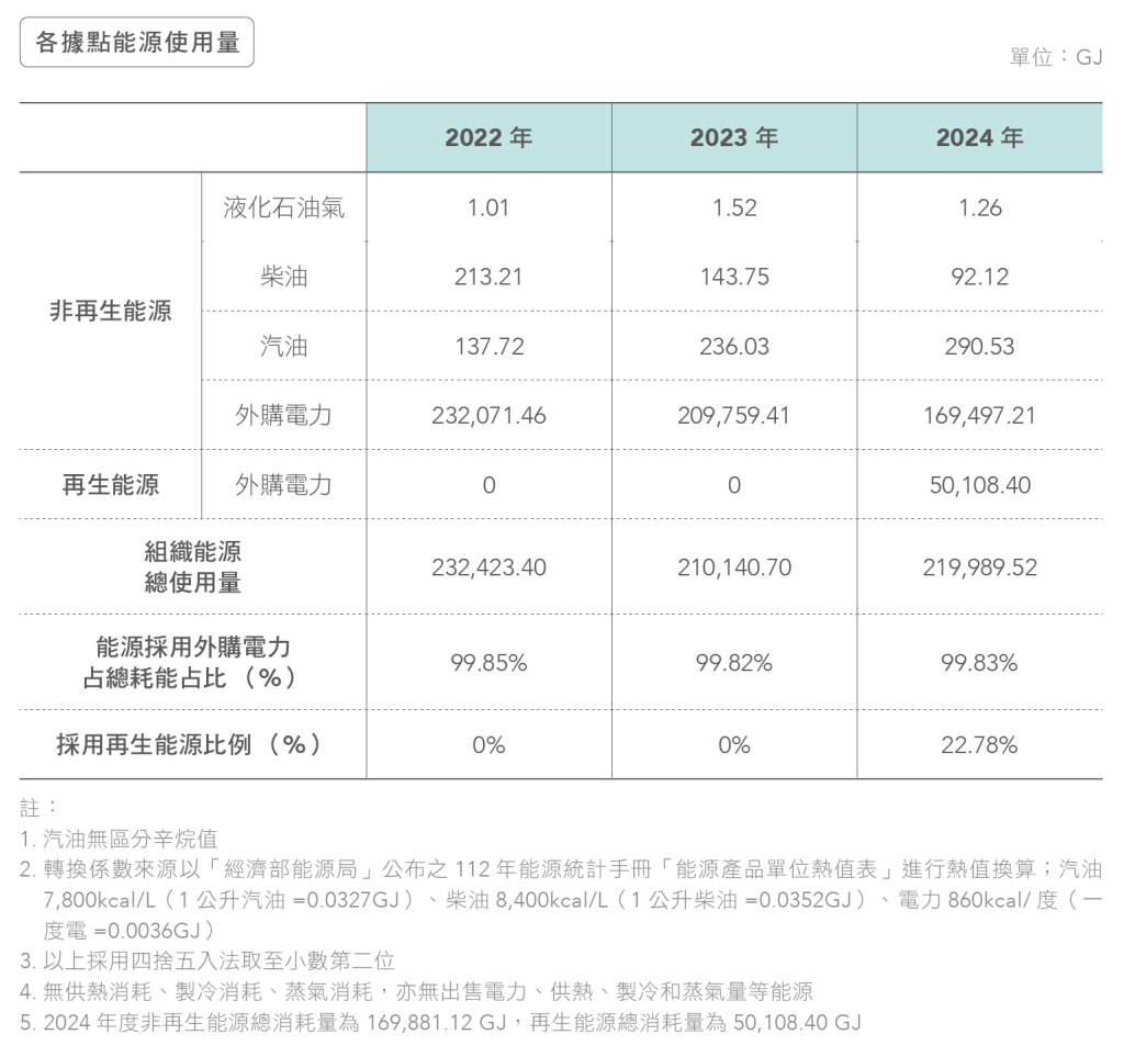 台半各生產據點使用的能源包含電力及柴油、汽油等燃料,2024年能源耗用主要以電力為主,佔比為99.8%。其餘燃料主要用於廠區內緊急發電機、堆高機、叉車等設備,山東廠近年將廠區內柴油叉車全數替換為電動叉車,估每年減少1.5 公噸柴油消耗。