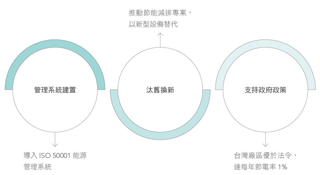 台半致力於提升能源效率,確實掌握用電及其他能源消耗之情形,台灣廠區訂定每年至少節電1%的目標。目前各廠分別依據自身能源使用情形訂定環保節能計畫,針對相對耗能之設備進行檢查,並選用新型節能設備替代,持續進行耗能設備更新。2023年起,利澤廠、山東廠逐步導入ISO 50001 能源管理系統,期許經由建立PDCA(Plan-Do-Check-Action)機制及制定相關管理方法,透過監控、計量能耗等環節,以數據分析找出耗能熱點,提升能源使用效率。